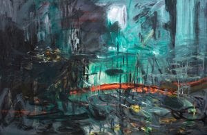 Industry rules In Vietnam. Factories can dump anything they want. In his painting, “Nine Dragon River Delta,” the dark unidentified blobs suffocate life and generate a deadly landscape.